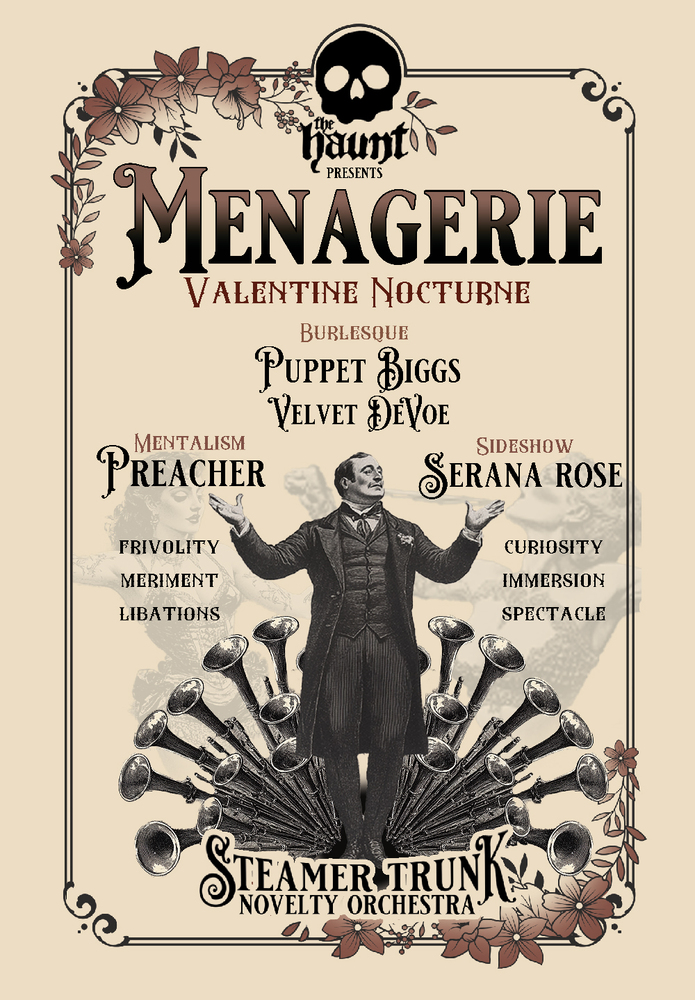 The Haunt invites you to step into a world of magic and enchantment at Menagerie: Valentine Nocturne. Join us February 13th or 14th for an unforgettable presentation of our Menagerie series, filled with tantalizing performances and delightful libations.